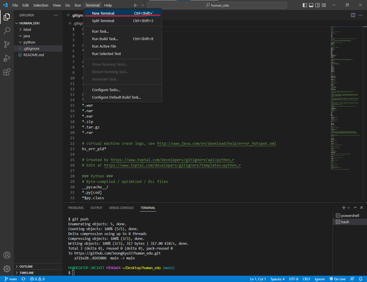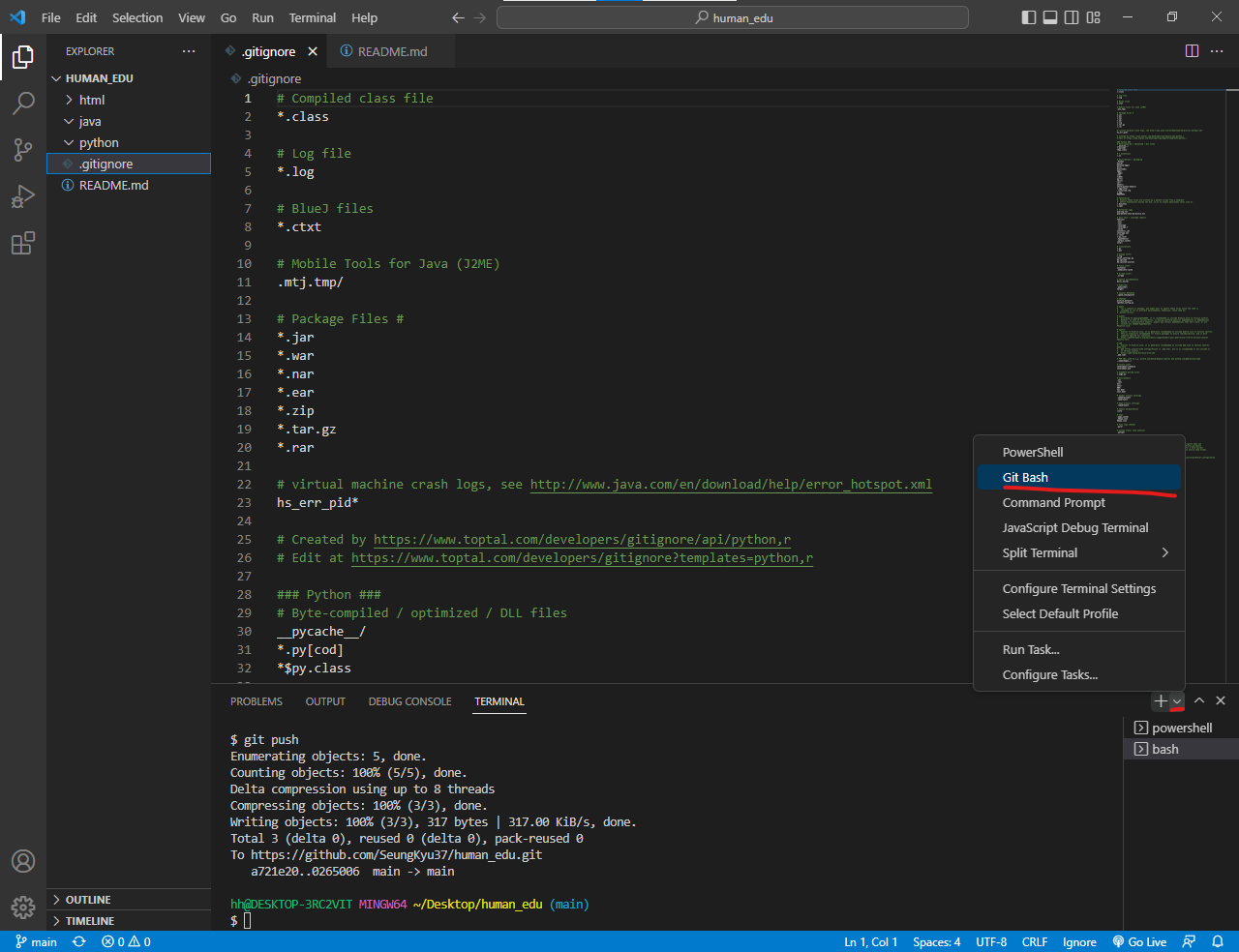 바탕 화면에 생성된 프로젝트 우 클릭 후 Git Bash Here 클릭