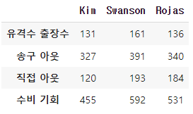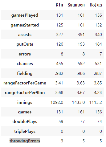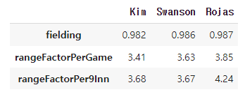 df_d1.rename(index={'gamesPlayed': "유격수 출장수", 'assists': "송구 아웃", 'putOuts' : '직접 아웃', 'chances' : '수비 기회'}, inplace=True)