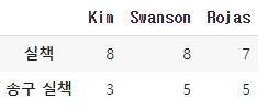 df_d2.rename(index={'errors' : '실책', 'throwingErrors' : '송구 실책'}, inplace=True)