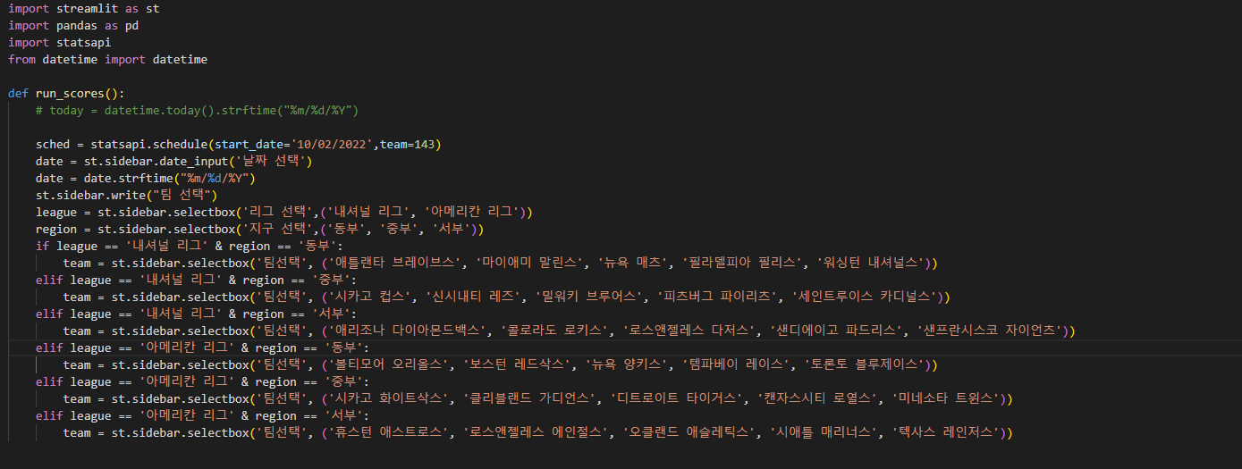 team = st.sidebar.selectbox('팀선택', ('애틀랜타 브레이브스', '마이애미 말린스', '뉴욕 매츠', '필라델피아 필리스', '워싱턴 내셔널스'))
