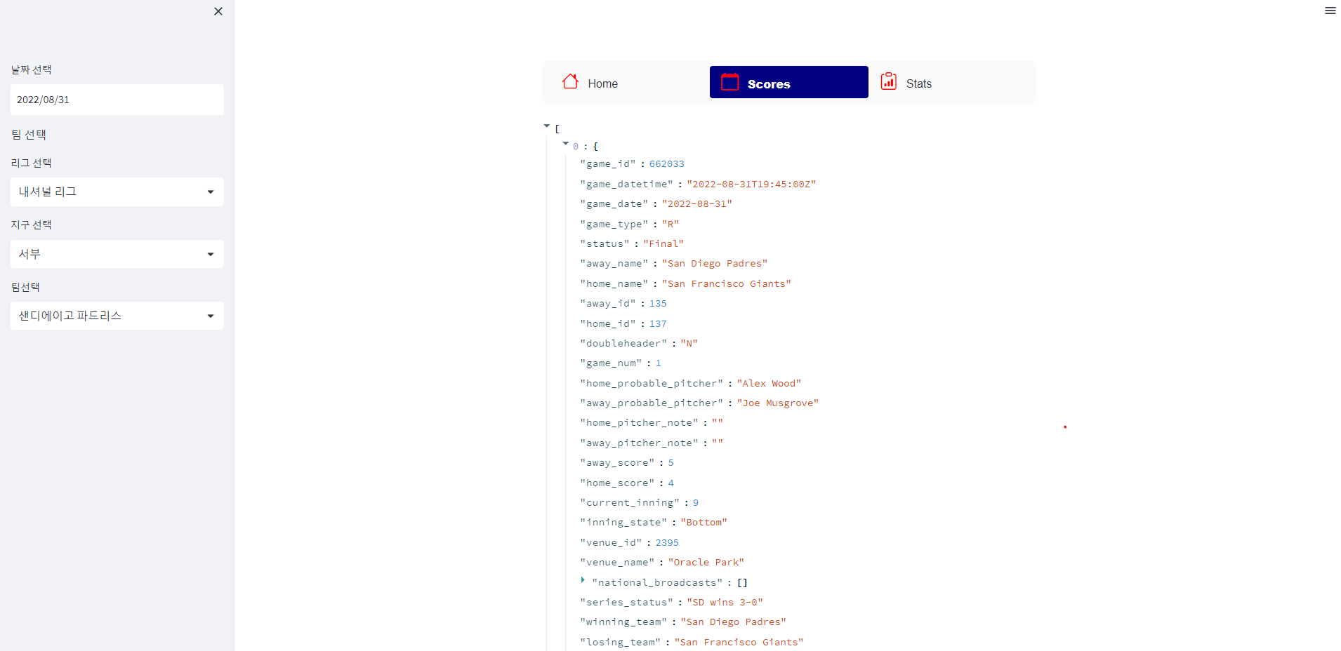MLB 시범경기가 시작하긴 했지만 아직 정식으로 시즌이 시작하지 않았기 때문에 오늘의 경기결과를 보여주는 Home 페이지는 나중에 제작하기로 하고 일단 경기를 검색할 수 있는 Scores페이지를 만들어보도록 한다.