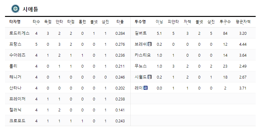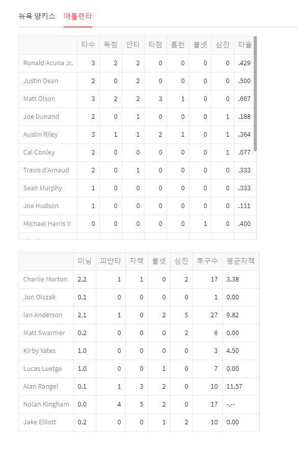 - 투수 기록은 이닝, 피안타, 자책, 볼넷, 삼진, 투구수, 평균자책점