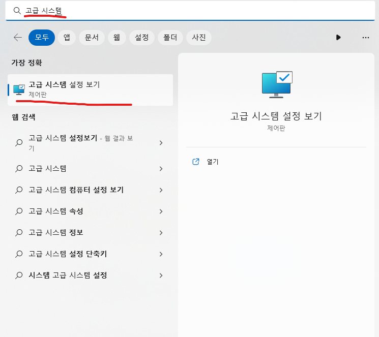 [검색] 창에서 "고급 시스템 설정"을 검색하여 [고급 시스템 설정 보기]로 이동