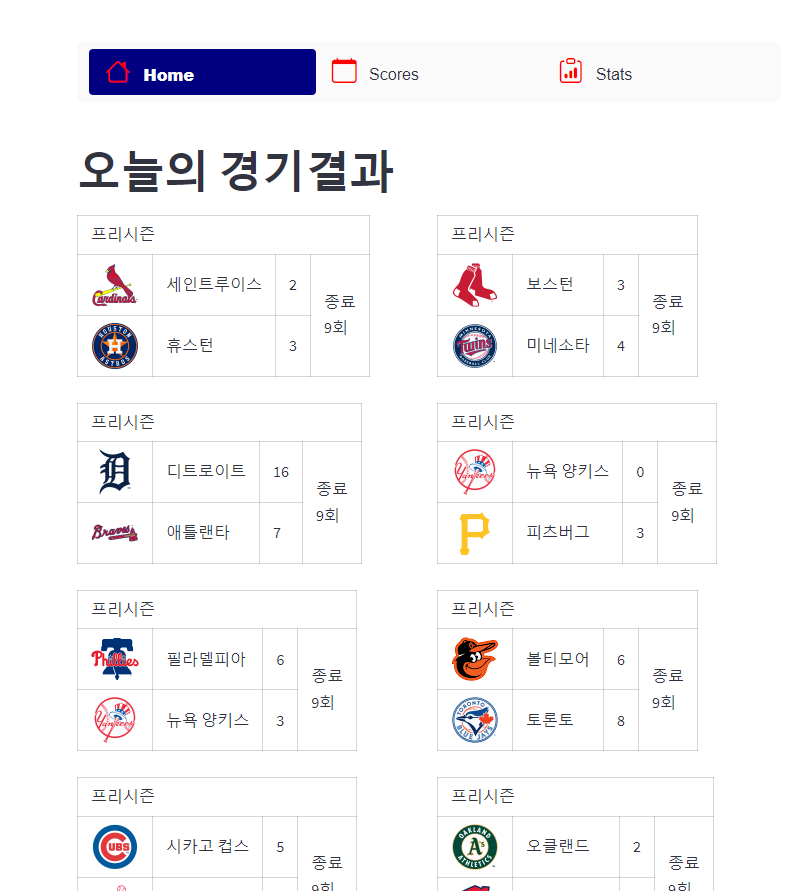 경기 검색 페이지에서 보여줄 수 있는 것은 다 보여주었다고 생각해서 홈페이지를 만들어보았다. 보통 야구 사이트를 들어가면 오늘의 경기결과를 페이지 가장 먼저 보여주는 것이 일반적이기 때문에 오늘의 경기결과를 보여주면 좋겠다고 생각했다. 구글의 mlb 경기 결과를 참고했다.