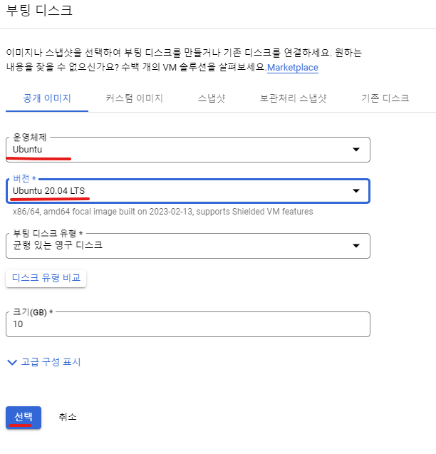 변경 클릭 후 운영체제 Ubuntu, 버전은 20.04 선택 후 선택 클릭