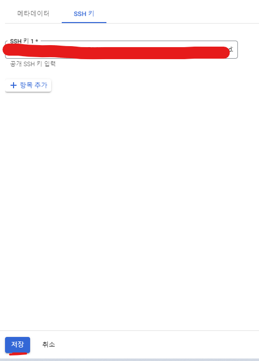 Compute Engine > 메타데이터 > SSH키 > SSH 키 추가 > gcp_key.pub 내용 입력 > 저장