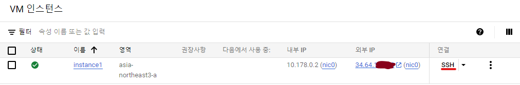 ssh -i {로컬pc의 키파일 경로} {VM의 user계정이름}@{VM의 외부 ip}
