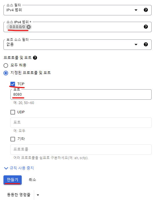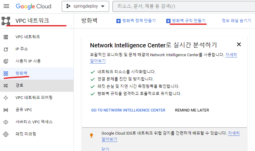 VPC 네트워크에서 방화벽으로 들어가 방화벽 규칙 만들기 클릭