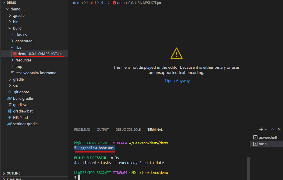 기존 스프링 프로젝트가 있는 곳에서 bash 터미널을 열어준다. 그 후 ./gradlew bootJar 명령어를 입력해주면 build > libs 폴더안에 {프로젝트ID}-{버전}-SNAPSHOT.jar (ex)demo-0.0.1-SNAPSHOT.jar) 파일이 생성된다.