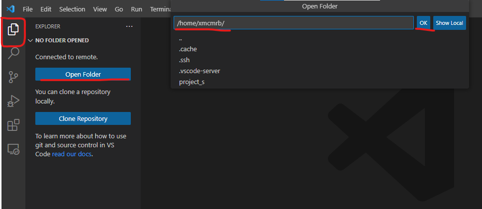 다시 ssh 원격접속으로 돌아와 Explorer 이동 후 상단 Open Folder를 클릭해주면 아래와 같이 경로를 설정해 줄 수 있다.