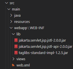 - 다음 의존성을 추가jstl 외부라이브러리 사용을 위해 src > main 폴더에 webapp > WEB-INF > lib 세개의 폴더를 추가하고 다음 파일 3개를 추가