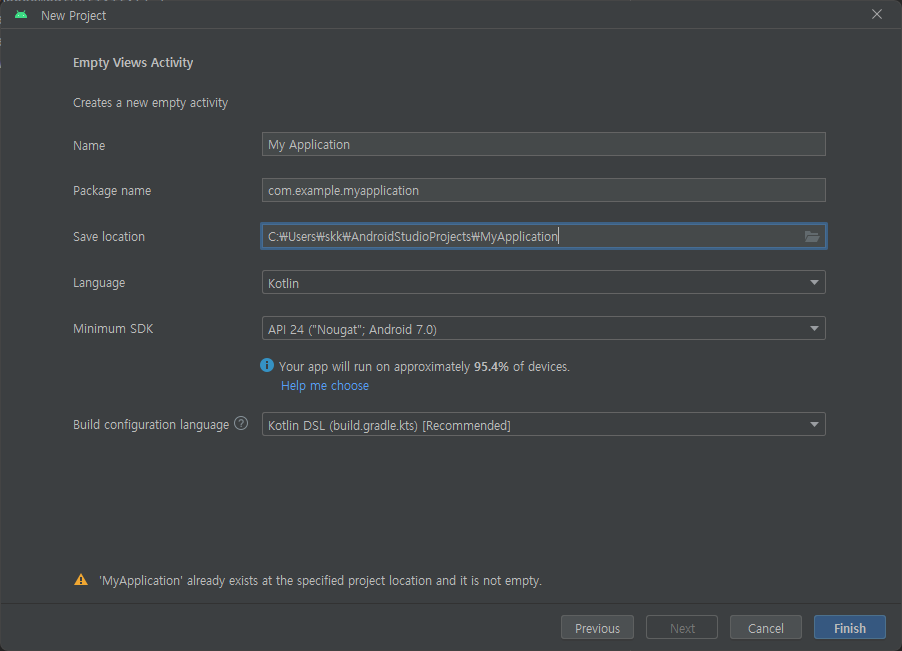 - 원하는 프로젝트 이름 및 언어 선택(Kotlin)
